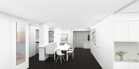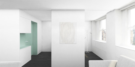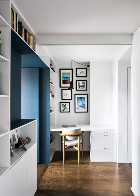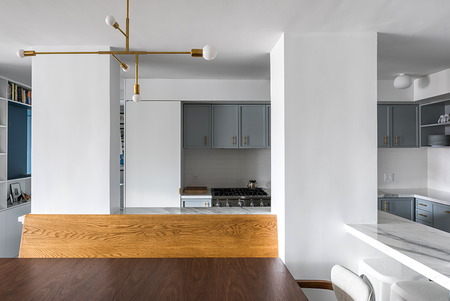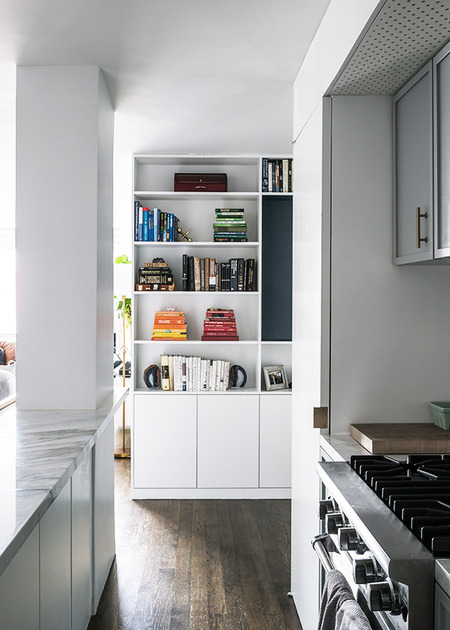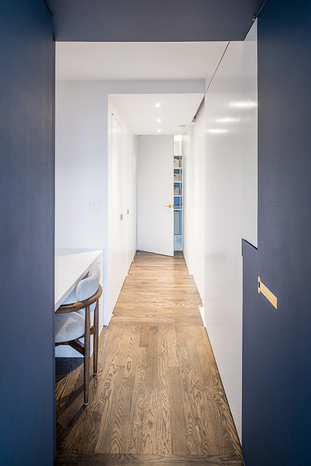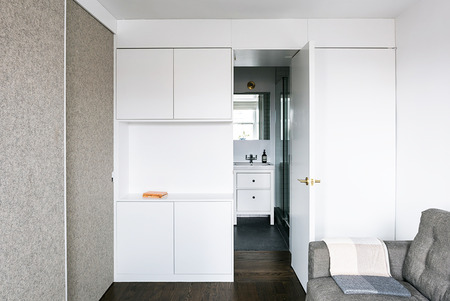 Two studio apartments in the West Village, one the clients’ existing residence and the other a neighboring unit, were combined into a flexible two bedroom home. Large sliding panels allow spaces on either side of the main living area to be opened into the public areas of the apartment or, when closed, to create private bedroom suites.