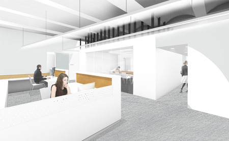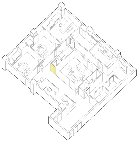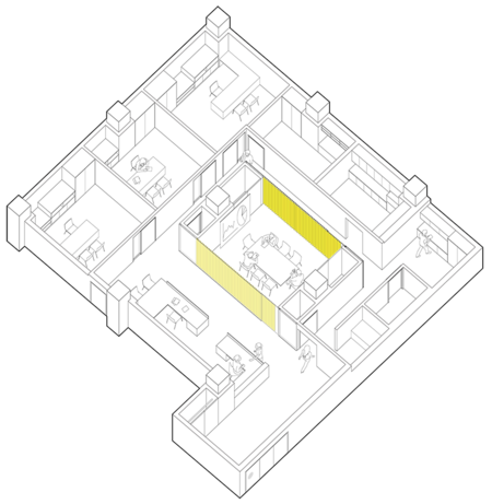 When the central room is being used, circulation around the office occurs in a loop. When the room is unused, or being used informally, routes within the office open up through the central space.