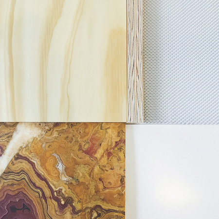 Simple square tiles line the areas below the counter, while lacquered plywood makes storage above. Both materials are muted against the contrasting activity and materiality of the counter.