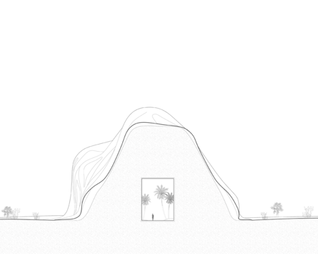 So we set about shaping desert sand, making a body for the dress, intent on building real mass and giving the statue new life. Drape Wall is an icon with an inside. What appears to be a monumental fence turns out to be a gathering place, a linear oasis, a Tex-Mex paradise, a little shade from the sun.