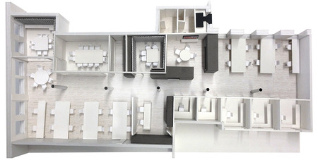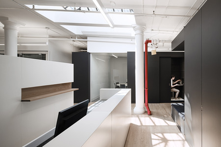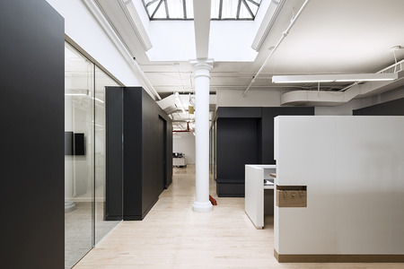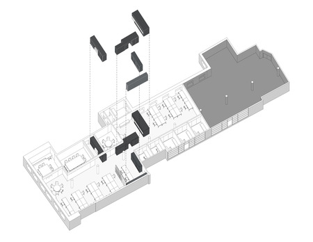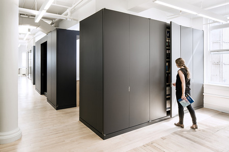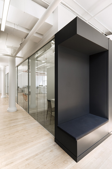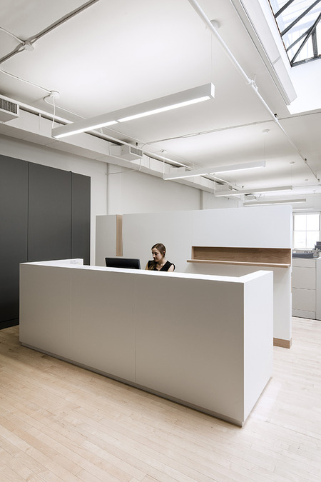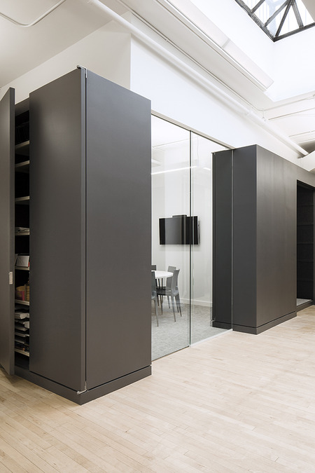 This office renovation and expansion in Manhattan uses a series of subtly differentiated volumes to simultaneously organize the functional areas of the workspace and to contain the major pieces of equipment that support those programs.