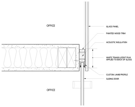 The office front system is detailed with panels of glass overlapping the ends of the office partitions. The jambs for the sliding doors are nested into the gap between the glass and the wall. The effect is an unbroken glazed surface along the entire length of the new work area.