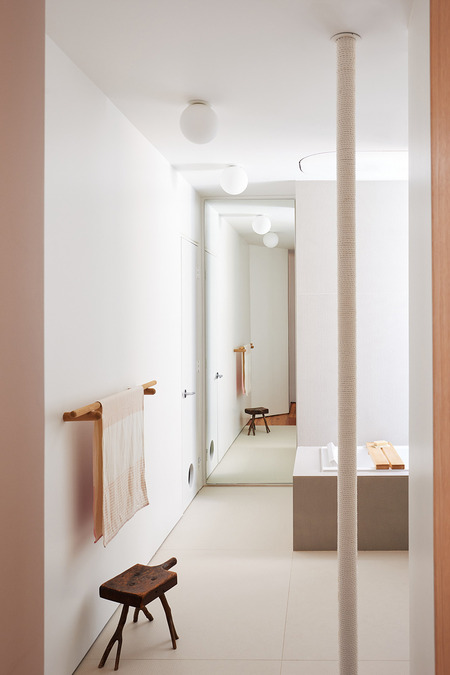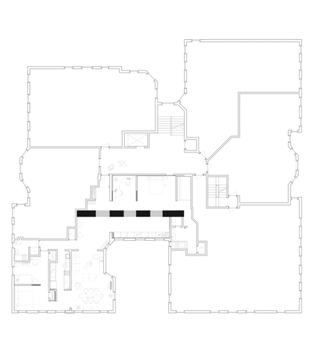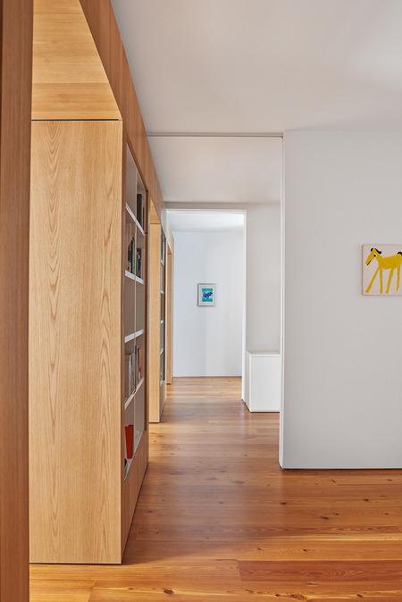 In this case, a wall – usually a device for dividing spaces – is instead used to bring the two apartments together. A continuous living space along the main windows in the apartment links the old and new apartments in a closer arrangement.