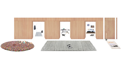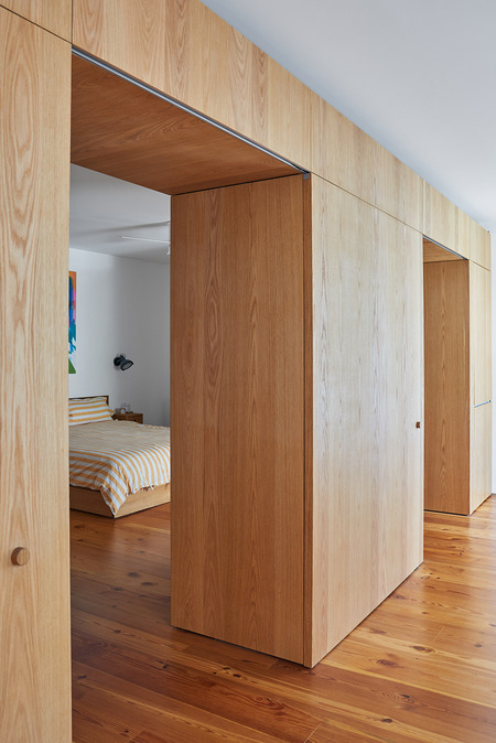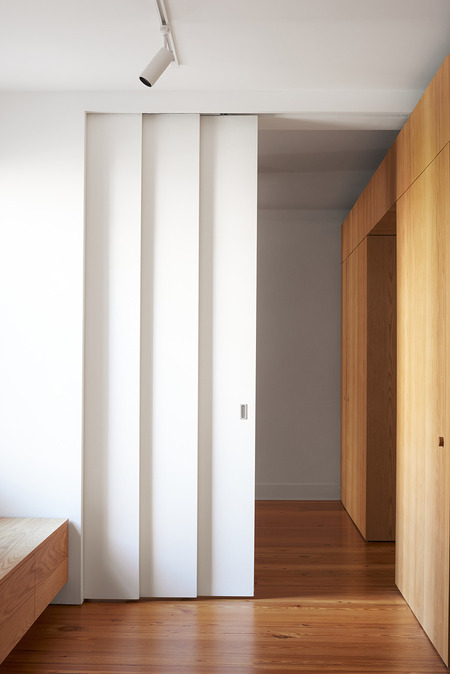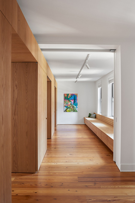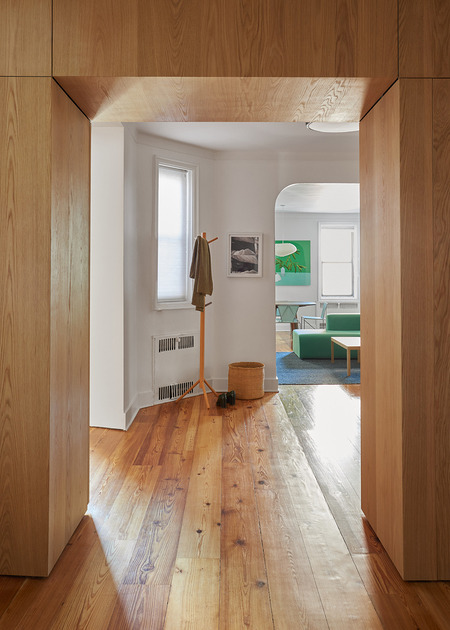 A long multifunctional wall is the centerpiece of this apartment renovation for a family in the Jackson Heights neighborhood of Queens, New York. The wall makes its way through a variety of spaces, creating a loose set of relationships. Panels slide and fold to variously connect and (momentarily) separate different areas within the apartment.