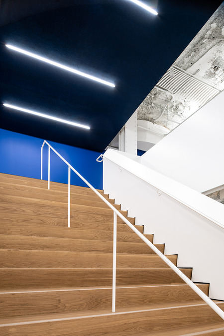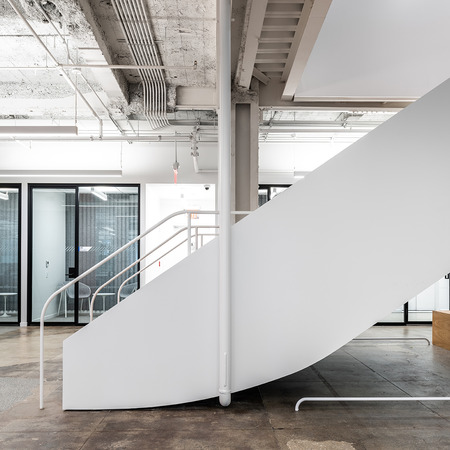 The two floors of the office are connected with a new stair oriented toward the cafeteria, the social heart of the office. The underside of the stair creates a semi-sheltered space for the entry and reception area, marking it as an open threshold to the working spaces within.