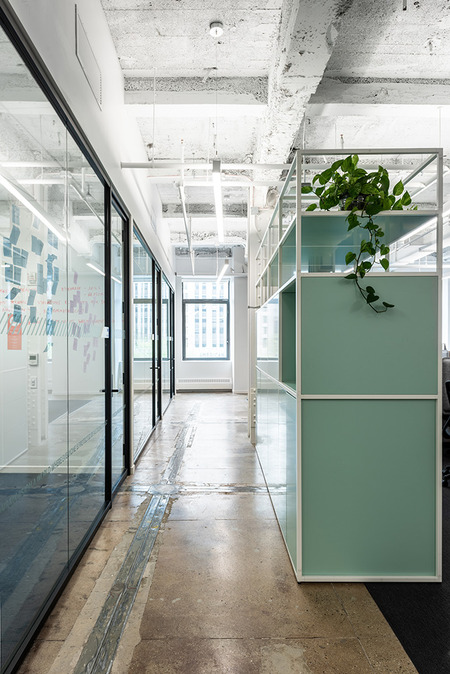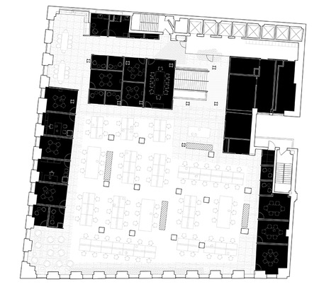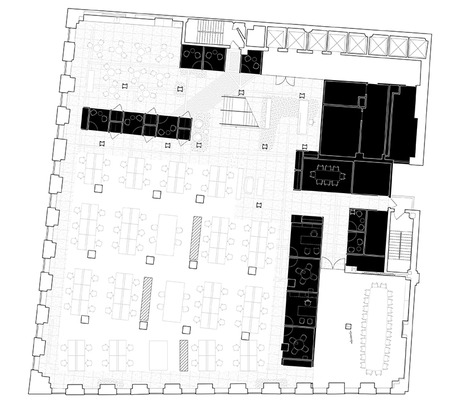 The building has a rich history, which is evident from the textured layers of floor finishes – mosaics, concrete, exposed electrical chases – and the irregular column grid that resulted from a major building expansion nearly a century ago. Rather than erasing this history the project strategically exposes surfaces in order to contrast old and new.
